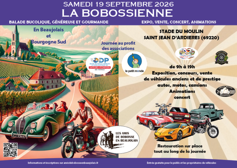 L’association porte notamment La Bobossienne 2026, une journée au profit de la Maison du Petit Monde en Beaujlais et l’Oeuvre des Pupilles des Sapeurs-Pompiers, autour des véhicules anciens et de prestige, des animations, de la musique et une balade pour ceux qui le souhaitent.